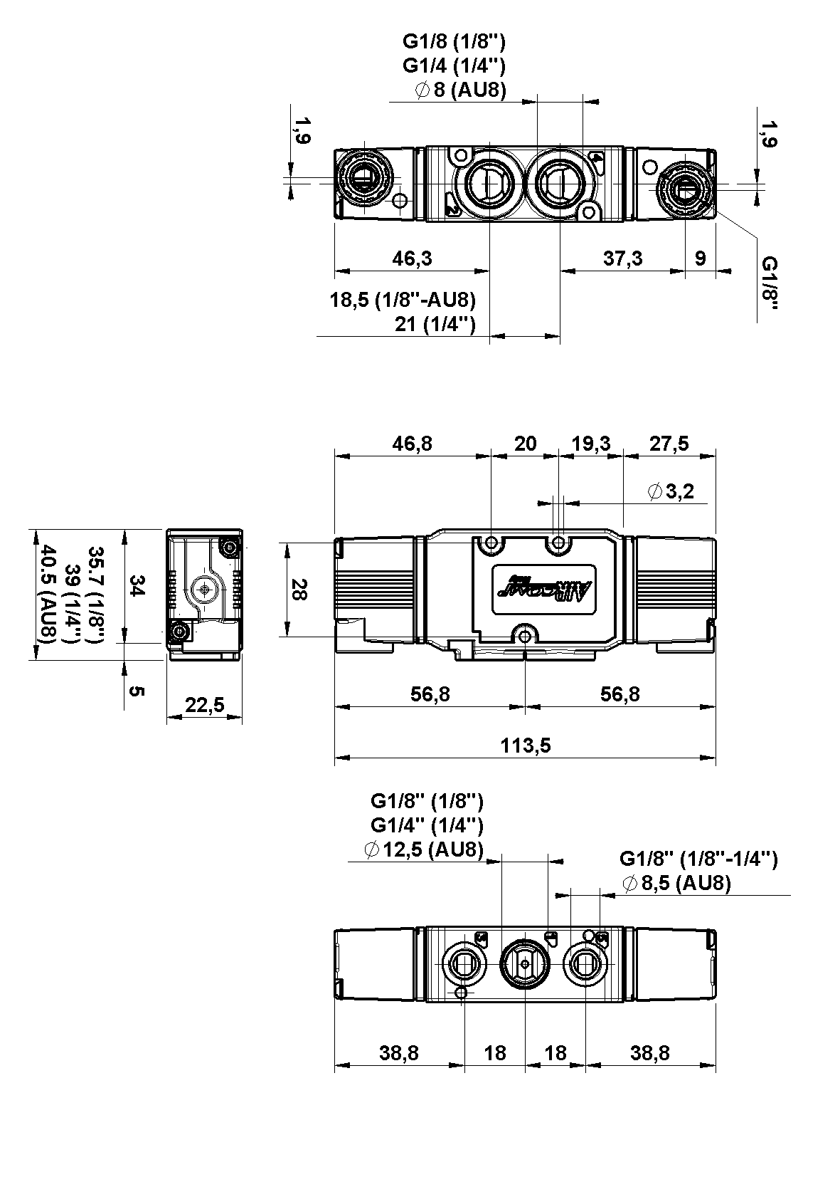 Pression de fonctionnement du pilote: (5/2) 0,5 ÷ 10 (0,05 ÷ 1,00 MPa) | (5/3) 2,1 ÷ 10 (0,21 ÷ 1,00 MPa)